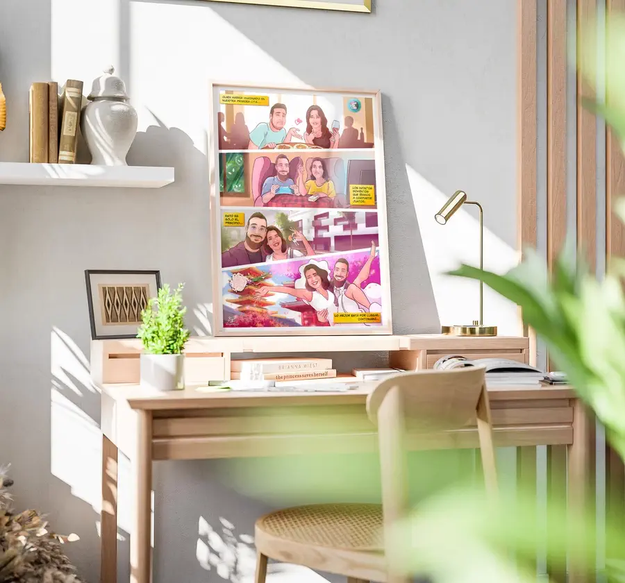 Esta Historia de Amor en Cómic Personalizado captura los momentos más memorables de su relación de la pareja. Desde su primer encuentro, hasta su compromiso, cada detalle se recrea de forma única y llena de arte, en un cómic hecho a medida.
